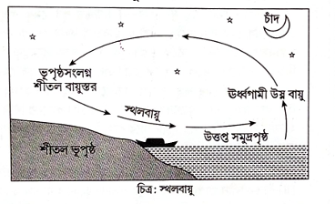 2.স্থালবায়ু: রাতে স্থলভাগ দ্রুত তাপ বিকিরণ করে শীতল হলেও জলভাগ তখনও উয় থাকে। তাই স্থলভাগের ওপর তখন উচ্চচাপ এবং সমুদ্রের ওপর নিম্নচাপ বিরাজ করে। ওই নিম্নচাপ পূরণ করার জন্য স্থলভাগ থেকে অপেক্ষাকৃত শীতল যে বায়ু সমুদ্রের দিকে ছুটে যায়, তাকে বলা হয় স্থলবায়ু।
