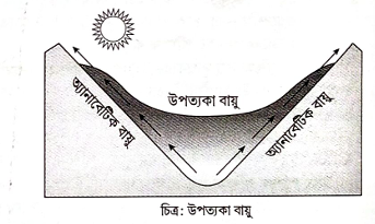 উপত্যকা বায়ু: দিনের বেলা সূর্যতাপে উত্তপ্ত উপত্যকার দু-দিকের ঢালের ওপরের বায়ু যে পরিমাণ উত্তপ্ত হয়, উপত্যকার মধ্যভাগের বাহু ততটা উত্তপ্ত হয় না। এই বায়ু শীতল থাকে এবং তার ফলে উচ্চচাপের সৃষ্টি করে ও ভারী হয়ে নীচের দিকে নামে। এই নিম্নগামী বায়ুর চাপে তখন উপত্যকার দু-দিকের ঢালের বায়ু ওপরের দিকে প্রবাহিত হয়। এই ঊর্ধ্বঢাল প্রবাহী বায়ুকে বলে উপত্যকা বায়ু। এর আর এক নাম অ্যানাবেটিক বায়ু (Anabatic Wind, গ্রিক শব্দ Ana = up ব ওপরের দিকে)।