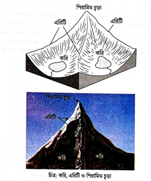 3 . পিরামিড চূড়া: ধারণা ও উৎপত্তি: পার্বত্য উপত্যকায় হিমবাহের উৎসমুখী ক্ষয়কার্যের অন্যতম নিদর্শন হল পিরামিড চূড়া। একটি পর্বতের বিভিন্ন দিকে পাশাপাশি তিন-চারটি বিপরীতমুখী ‘করি’-র সৃষ্টি হলে সেগুলি ক্রমাগত মস্তকদেশের দিকে ক্ষয়প্রাপ্ত হয়ে একটি পিরামিডের মতো আকৃতির চূড়া গঠন করে। এজন্য এর নাম পিরামিড চূড়া বা হর্ন। বৈশিষ্ট্য: [I] পিরামিড চূড়ার বিভিন্ন দিকে বেশ কয়েকটি করি থাকে। [ii] এগুলি পর্বতের শীর্ষদেশ বা শৃঙ্গ। উদাহরণ: আল্পস পর্বতের ম্যাটারহর্ন এরকম একটি বিখ্যাত পিরামিড চূড়া। গঙ্গোত্রীর কাছে নীলকণ্ঠ শৃঙ্গও পিরামিড চূড়ার নিদর্শন।