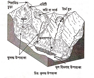 4. ঝুলন্ত উপত্যকা: ধারণা ও উৎপত্তি: অনেকসময় পার্বত্য অঞ্চলে সৃষ্ট অপেক্ষাকৃত বেশি শক্তিশালী ও গভীর প্রধান হিমবাহ উপত্যকায় দু-পাশ থেকে অনেক কম শক্তিশালী অগভীর ছোটো ছোটো হিমবাহ এসে মেশে। গভীরতার এই পার্থক্যের জন্য উপহিমবাহ যেখানে প্রধান