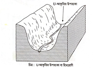 5 . U-আকৃতির উপত্যকা বা হিমদ্রোণি: ধারণা ও উৎপত্তি: হিমবাহ পার্বত্য অঞ্চলে যে উপত্যকার মধ্য দিয়ে অগ্রসর হয়, তাকে হিমদ্রোণি বলে। ওই উপত্যকায় হিমবাহের পার্শ্বক্ষয় ও নিম্নক্ষয় প্রায় সমানভাবে হয় বলে উপত্যকাটি প্রশস্ত, তলদেশ অনেকটাই মসৃণ এবং পার্শ্বদেশ খাড়া ঢালবিশিষ্ট উপত্যকায় পরিণত হয়। অর্থাৎ, উপত্যকাটির আকৃতি ইংরেজি অক্ষরের মতো দেখতে হওয়ায় একে U-আকৃতির উপত্যকা বলে। উদাহরণ: আল্লস, হিমালয় পর্বতে U-আকৃতির উপত্যকা দেখতে পাওয়া যায়।