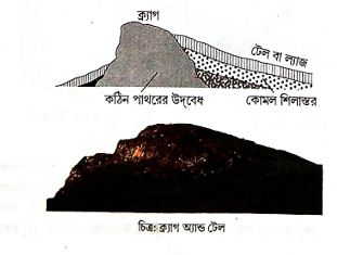 6. ব্র্যাগ অ্যান্ড টেল: ধারণা ও উৎপত্তি: হিমবাহের গতিপথে অনেকসময় কোনো কঠিন শিলা উঁচু হয়ে অবস্থান করে, যেমন-কোনো আগ্নেয় উদ্দ্বধ এবং তার পিছনে থাকে কোমল শিলা। এরকম ক্ষেত্রে কঠিন শিলা কোমল শিলাকে হিমবাহের ক্ষয়কার্য থেকে কিছুটা রক্ষা করে। ফলে কোমল শিলা গঠিত অংশ তখন উঁচু ঢিবির আকারে থাকা কঠিন শিলার পিছনে পুচ্ছ (tail) বা ল্যাজের মতো বিস্তৃত থাকে।এর মধ্যে এবড়োখেবড়ো উঁচু ঢিবিটিকে ব্র্যাগ এবং পুচ্ছটিকে টেলবলে। বৈশিষ্ট্য: [i] ব্র্যাগ অ্যান্ড টেলের ব্র্যাগ অমসৃণ আর টেল মসৃণ হয়। [ii] টেল 2 কিমি পর্যন্ত দীর্ঘ হয়ে থাকে। উদাহরণ: স্কটল্যান্ডের এডিনবরায় একটি সুবৃহৎ ব্র্যাগ অ্যান্ড টেল আছে।