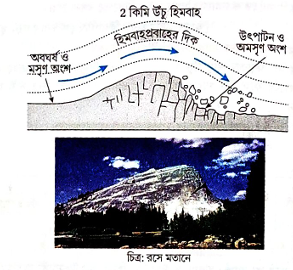 7.রসে মতানে: ধারণা ও উৎপত্তি: হিমবাহের প্রবাহপথে শিলাখণ্ড ঢিবির আকারে উঁচু হয়ে থাকলে ক্ষয়কার্যের ফলে হিমবাহের প্রবান্ধে দিকে অবঘর্ষ প্রক্রিয়ায় শিলাখণ্ডটি মসৃণ এবং বিপরীত দিকে উৎপটন