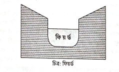৪.ফিয়র্ড: ধারণা ও উৎপত্তি: হিমবাহের ক্ষয়কার্যের ফলে সমুদ্রোপকূলসংলগ্ন পার্বত্যভূমিতে বহু খাত তথা হিমবাহ উপত্যকা সৃষ্টি হয়। সমুদ্রপৃষ্ঠ থেকে এগুলির গভীরতা বেশি হলে অঞ্চলটি বরফমুক্ত হওয়ার পর এগুলিতে সমুদ্রের জল প্রবেশ করে। জলপূর্ণ এই খাত বা উপত্যকাগুলিকেই ফিয়র্ড বলে। এর মধ্যে ক্ষুদ্রাকৃতি অগভীর ফিয়র্ডকে ফিয়ার্ড বলা হয়। বৈশিষ্ট্য: [i] ফিয়র্ড উপকূলে জন্যে গভীরতা খুব বেশি হয়। [ii] ফিয়র্ডের মাঝের তুলনায় প্রান্তভাগো জলের গভীরতা কম হয়।