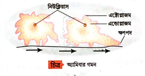 অ্যামিবার গমন পদ্ধতি:- অ্যামিবা এককোশী প্রাণী। এদের জামন অঙ্গ ক্ষণপদ বা সিউডোপোডিয়া (pseudopodia)। দেহমধ্যস্ব প্রাটোপ্লাজমের ঘনত্বের পরিবর্তনের দ্বারা (সল-জেল মতবাদ) অ্যামিবা প্রদেহের পরিধির দিকে অস্থায়ী পদ বা ক্ষণপদ সৃষ্টি করে। ক্ষণপদটি ধীরে হীরে বর্ধিত হয় এবং এটির আঠালো অগ্রভাগটিকে কোনো কঠিন বস্তুর সঙ্গো আটকে দেয়। এরপর দেহমধ্যস্থ প্রোটোপ্লাজমকে ওই ক্ষণপদের মধ্যে ধীরে ধীরে প্রবাহিত করে; ফলে অ্যামিবার পশ্চাদ্ভাগ ক্রমশ গুটিয়ে আসে এবং ক্ষণপদটি অবলুপ্ত হয়, ফলে প্রাণীটি গতিপথের দিকে কিছুটা অগ্রসর হয়। তখন অ্যামিবা পুনরায় গতিপথের দিকে ক্ষণপদ সৃষ্টি করে আগের মতো সামনের দিকে অগ্রসর হয় এইভাবে পর্যায়ক্রমে ক্ষণপদের গঠন ও অবলুপ্তি ঘটিয়ে প্রাণীটি খুব ধীরে ধীরে স্থান পরিবর্তন করে। এরকম গতিকে অ্যামিবয়েড গতি বলে।