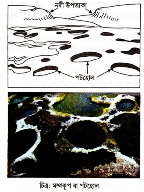 5. মন্থকূপ বা পটহোল: ধারণা ও উৎপত্তি: উচ্চগতি বা পার্বত্য প্রবাহেনদীর প্রবল স্রোতের সঙ্গে বাহিত প্রস্তরখণ্ড, নুড়ি প্রভৃতি ঘুরতে ঘুরতে নদীর তলদেশ দিয়ে অগ্রসর হয়। এর ফলে পরিবাহিত নুড়ি ও প্রস্তরখণ্ডের দ্বারা ঘর্ষণজনিত ক্ষয়ের কারণে নদীখাতে কূপের মতো অনেক গর্তের সৃষ্টি হয়। এগুলিকে বলা হয় মন্থকূপ বা পটহোল।উদাহরণ: তিস্তা নদীর পার্বত্য প্রবাহে অনেক মন্থকূপ দেখা যায়।