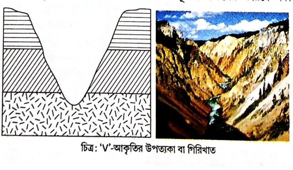 2. ‘V’-আকৃতির উপত্যকা বা গিরিখাত: ধারণা ও উৎপত্তি: আর্দ্র ওআর্দ্রপ্রায় অঞ্চলে নদীর উচ্চ বা পার্বত্য প্রবাহে ভূমির ঢাল বেশি থাকায় নদীগুলি প্রবলভাবে নিম্নক্ষয় করে। এরূপ নিম্নক্ষয়ের কারণে নদী