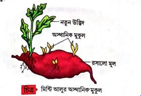 1 মূল (Root):- কয়েকটি উদ্ভিদ মূলের সাহায্যে অঙ্কাজ জনন সম্পন্ন করে। রাঙা আলু বা লাল আলুর রসালো মূল (fleshy root) থেকে অস্থানিক মুকুল সৃষ্টি হয় যা থেকে অঙ্গজ জনন পদ্ধতিতে নতুন উদ্ভিদ জন্মায়।
