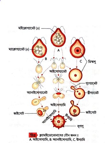 (iii) উগ্যামি:- এক্ষেত্রে মিলিত গ্যামেটদ্বয়ের স্ত্রী গ্যামেটটি বড়ো ও নিশ্চল প্রকৃতির এবং পুংগ্যামেটটি ক্ষুদ্র ও সচল প্রকৃতির হয় অর্থাৎ দুটি ভিন্নধর্মী গ্যামেট মিলিত হয়। এই ধরনের যৌন জনন ক্ল্যামাইডোমোনাস, ভলভক্স, ইডোগোনিয়াম নামক শৈবালে দেখা যায়।