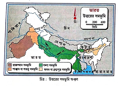 উত্তরের সমভূমি অঞ্চলের ভূপ্রকৃতি: উত্তরে হিমালয় পার্বত্যভূমি এবং দক্ষিণে উপদ্বীপীয় মালভূমির মধ্যবর্তী এলাকায় গঙ্গা, সিন্ধু, ব্রহ্মপুত্র এবং এদের বিভিন্ন উপনদী ও শাখানদীগুলি পলি সঞ্চয় করে যে বিস্তৃত সমতলভূমি গঠন করেছে, তাকে বলা হয় উত্তরের সমভূমি অঞ্চল। স্থানীয় বৈচিত্র্য অনুসারে এই সুবিস্তৃত অঞ্চলটিকে চারটি উপ-অঞ্চলে ভাগ করা যায়-